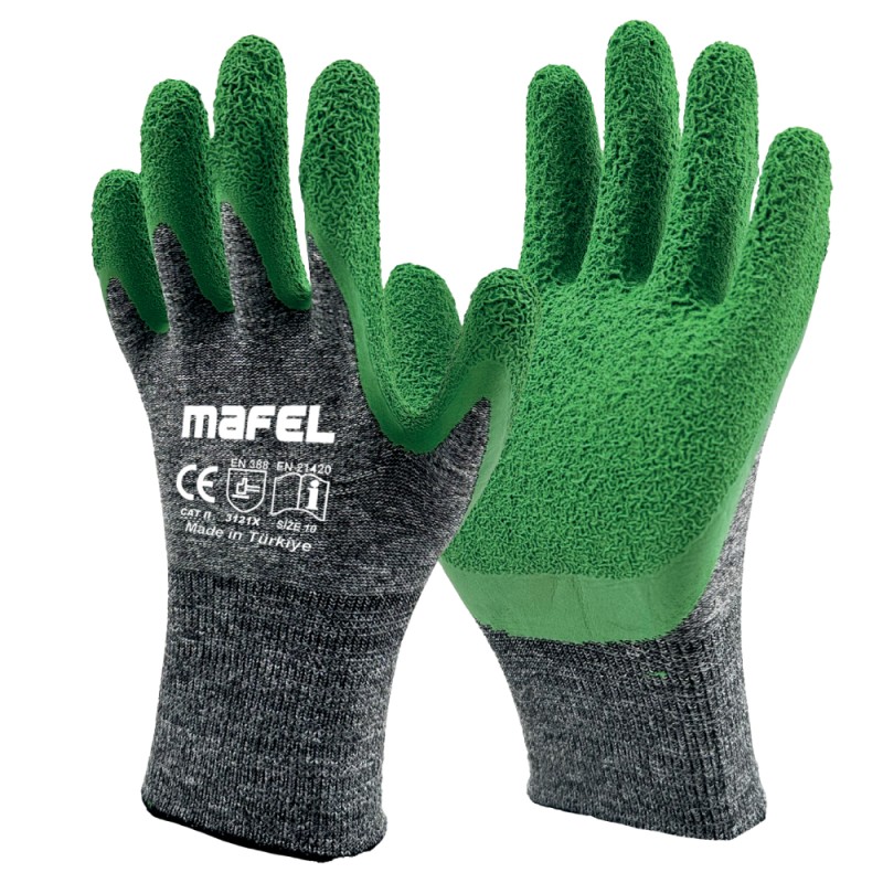 Yüksek kaliteli polyester iplikten örülmüş ve lateks ile avuç içi kaplanmış iş eldiveni.